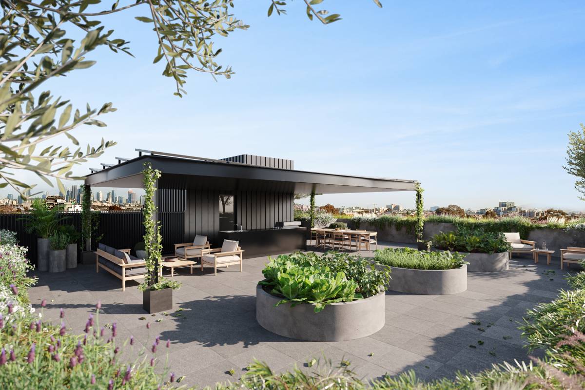 Certified as a 7 Star Energy Efficient Building, Albion Terrace will offer a communal roof terrace with barbecue facilities, vegie patches and established trees, solar hot water, solar panels, high performance glass, water harvesting to feed a recycled water fire tank and apartment needs, cross ventilation and energy efficient appliances. The rooftop stands five floors above the street level, ensuring this unique building will have stunning panoramic views of the historic inner-city suburbs of Melbourne and beyond to the CBD, the Dandenongs and the Macedon Ranges.